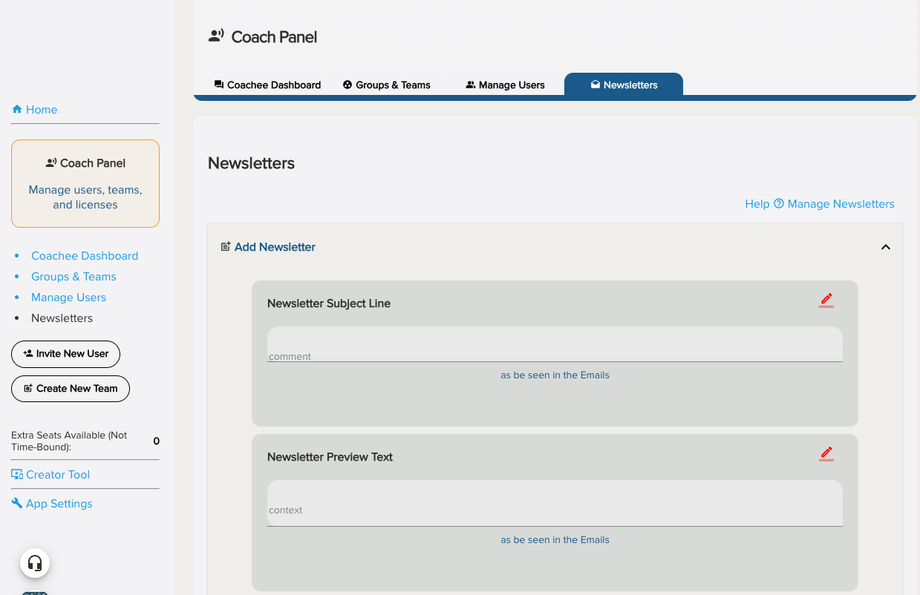 Coach Privileges: Coaches can select up to 10 teams they own to send the newsletter messages to.