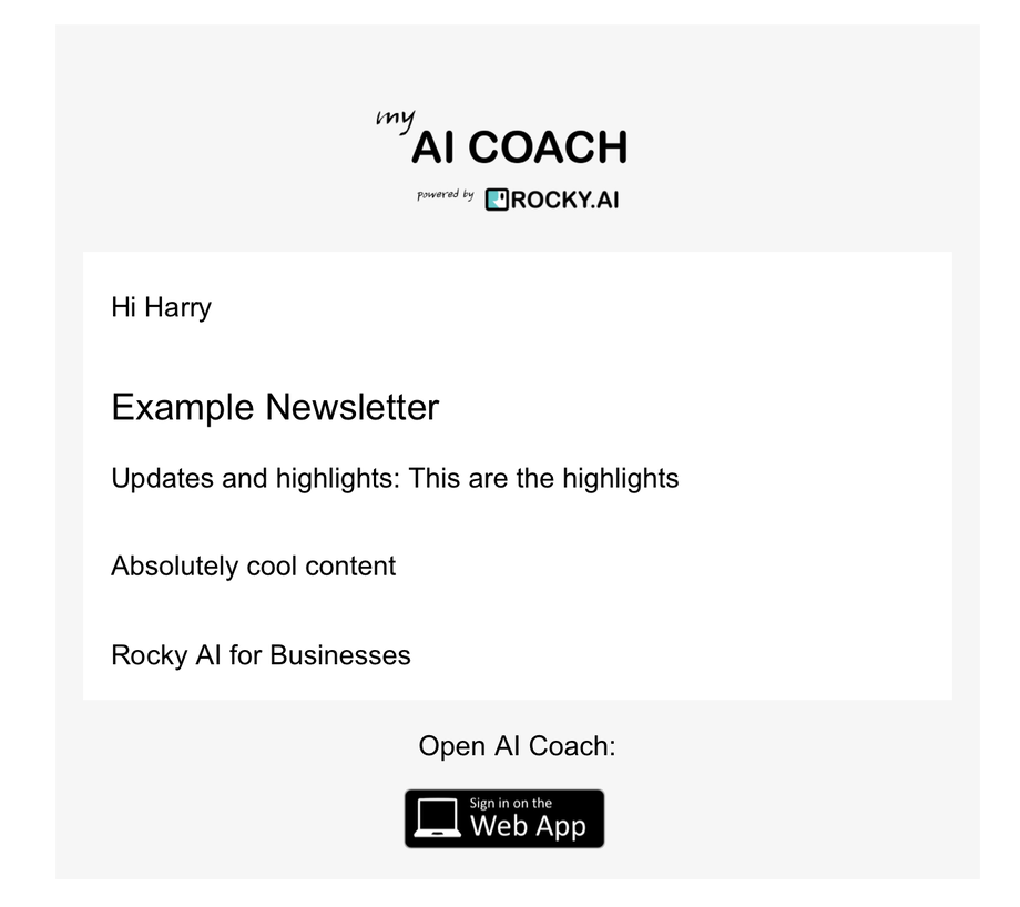 The Rocky.ai White Label Newsletter feature allows admins and coaches to send customized messages to users through email and the app's home screen. The newsletters are fully configurable, allowing for flexible scheduling, content design, and targeted audience selection.