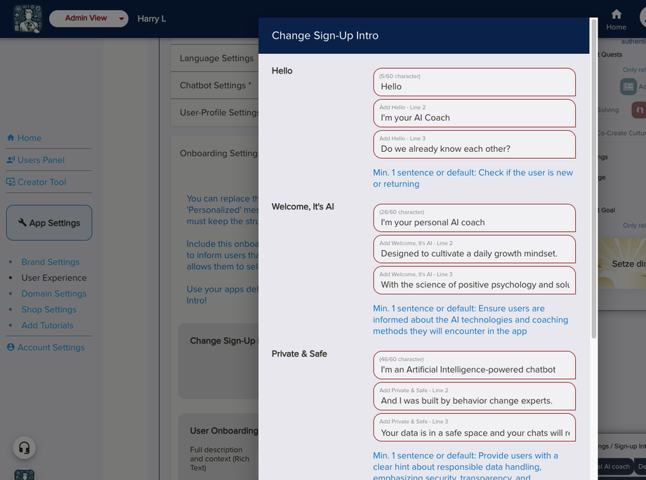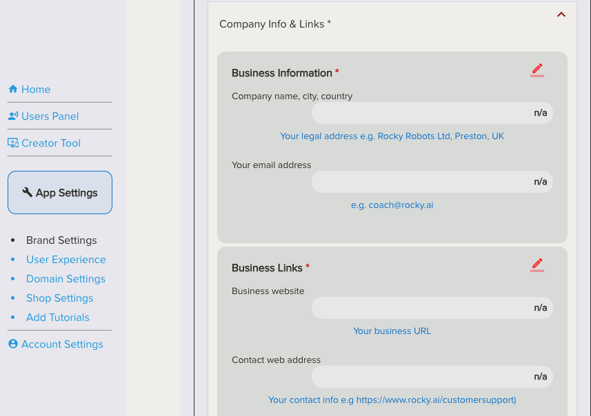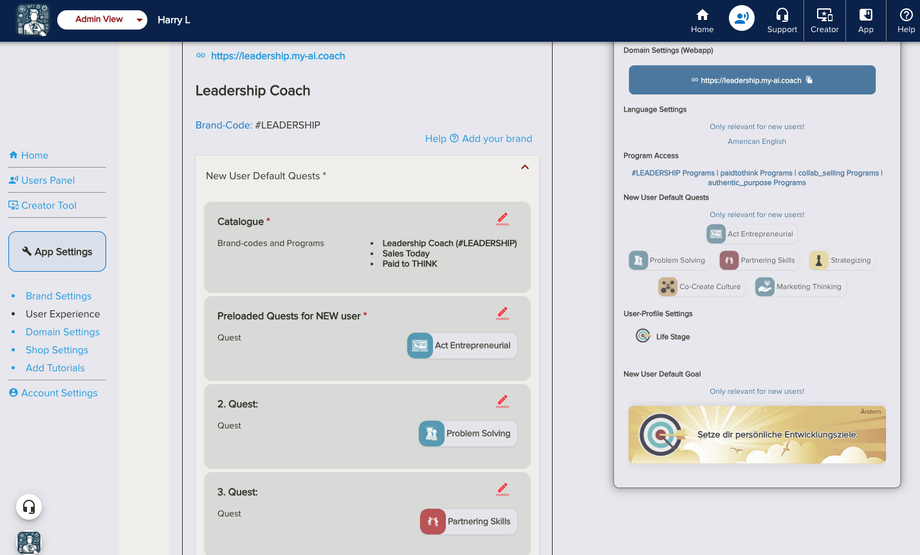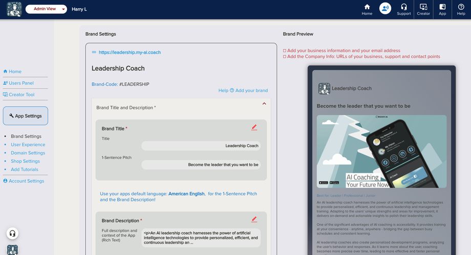 yourbrand.my-ai.coachor a custom URL if configured). - More info of setting up a new brand: Step 1.1: Add your own brand - Set up Brand-Code