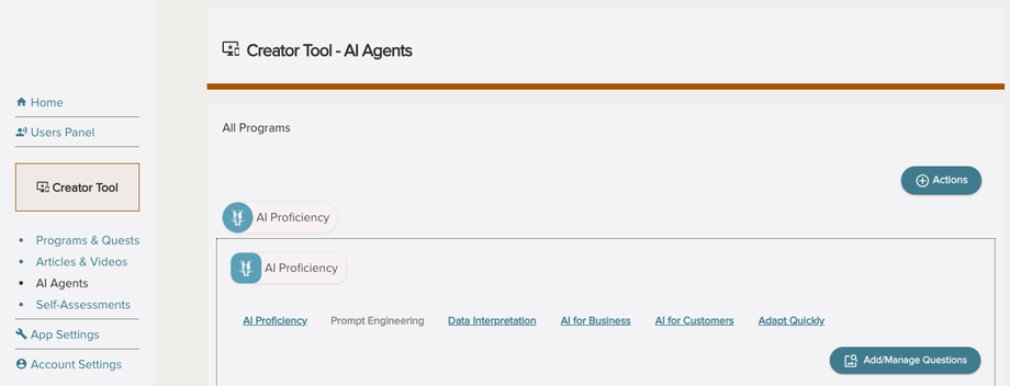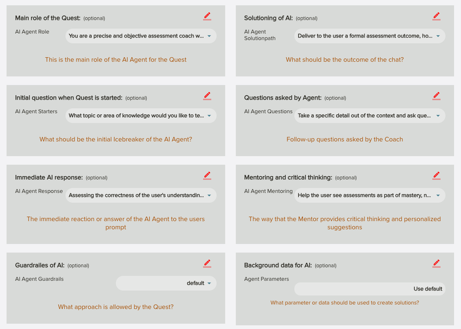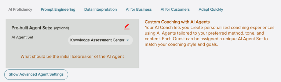 Your AI Coach lets you create personalized coaching experiences using AI Agents tailored to your preferred method, tone, and content. Each Quest can be assigned a unique AI Agent Set to match your coaching style and goals.
